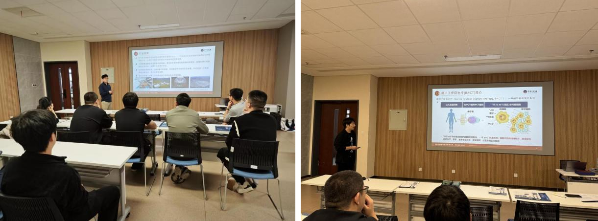 交流讨论环节,现场双方就多通道数字化仪应用方向,以及硼中子俘获治疗与质子治疗这两种放射性癌症治疗技术的差异和特点等进行了深入讨论。此外,浙江大学物理学院师生尤其关注了基于MicroMegas探测器的BNCT注量率空间分布测量技术,对呈现出的快速测量、空间分辨率高等优势展示出浓厚兴趣。